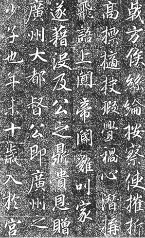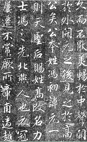 碑文分三段。第一段写高力士的身世:“公本姓冯讳元一。则天圣后赐姓高,改名力士,广菅潘州人也。其先祖冯盎,五岭之望族。皇唐初督都广韶等一十八州,封耿国公。公童龄入侍玉阶,则天圣后知必成器,赐以佳名,教以美艺。”说明高力士出身于名门望族,幼年入官,受到武则天的赏识,与唐史记述系岭南讨击使李千里所进,后被太监高延福收为养子一说,不相符合,有待史学家进一步考证。