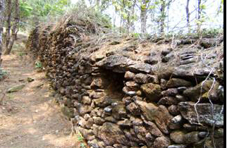 高州市的东北部是丘陵地区,古石墙就分布在这些丘陵之中,考其地形地势,往往石墙分布的地方都有纵深的峡谷或盆地,周围诸峰错落,显然是驻军布防之所。主要遗迹是一些大型石构筑物,其形制非常古朴、原始,墙体全部采用大小不等的石块垒叠而成,石质与山上裸露的岩石一致,当为就地取材所建,现存高度大约