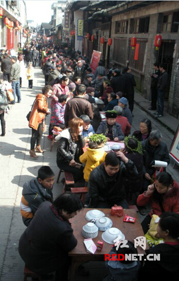 今天凌晨,黔阳古城数百名群众自发采摘回来荠菜,经过淘洗后,在大锅内与鸡蛋同煮,中午在现场,摆放有数百张长桌,供人免费品尝用大锅煮熟配料制作成的荠菜鸡蛋,从各地赶来的近2000名群众和游客分享了此次盛宴。