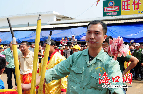 3月12日,海口三江镇军坡节,“穿杖”表演。
