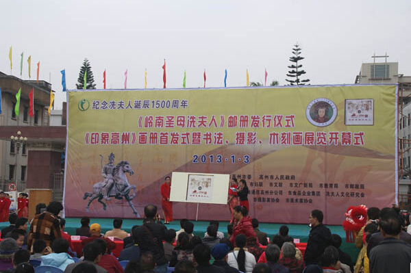 1月3日上午,值纪念冼夫人诞辰1500周年之际,由高州市委、市政府主办,市委宣传部、市妇联、市文联、市文广新局、市教育局、市邮政局等单位联合承办的《岭南圣母冼夫人》纪念邮册发行仪式,《印象高州》画册首发式暨书法、摄影、木刻画展览开幕式在市委广场隆重举行。我市市委副书记、代市长李德,茂名市妇联主席董晓璐,我市市委常委、宣传部部长杜坤玲,市人大常委会副主任、市总工会主席邓铁辉,副市长李康、莫燕,市政协副主席冯明及茂名、高州两级相关部门的领导出席了仪式。发行仪式吸引了广大市民的关注,一大批市民一早就前往现场参加仪式启动活动。