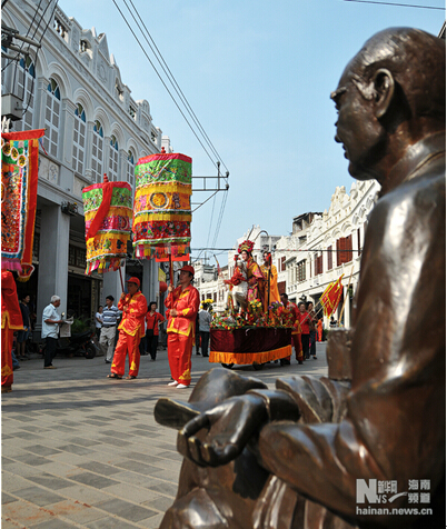 新华网海南频道3月20日电(喻涛)3月20日,第十二届冼夫人文化节之“装军巡游”活动在海口得胜沙步行街举行。当日,“出征”队伍路过的街巷布满了“冼”字红旗,市民纷纷驻足观望,喜庆热闹的气氛为海口骑楼文化老街增色不少。